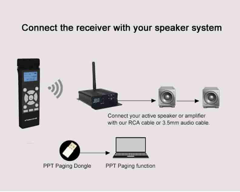 The wireless microphone system in this article consists of two main components: a wireless microphone and a receiving module (also known as a receiver).